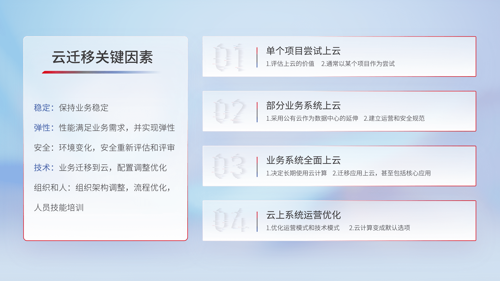 结合实际业务,,,,从规划设计、、云平台选型、、、云原生改造、、、、数据迁移、、集成交付,,,,迁移全过程为客户识别最佳上云路径,,,做好风险识别管理,,设计网络架构、、、身份权限、、、、安全审计合规、、、、操作审计、、、日志审计、、、、监控告警策略、、、多站点容灾设计等,,,对云上基础设施进行整体规划,,,,提升IT治理水平,,,,以满足弹性、、高可用、、高性能的需求。。