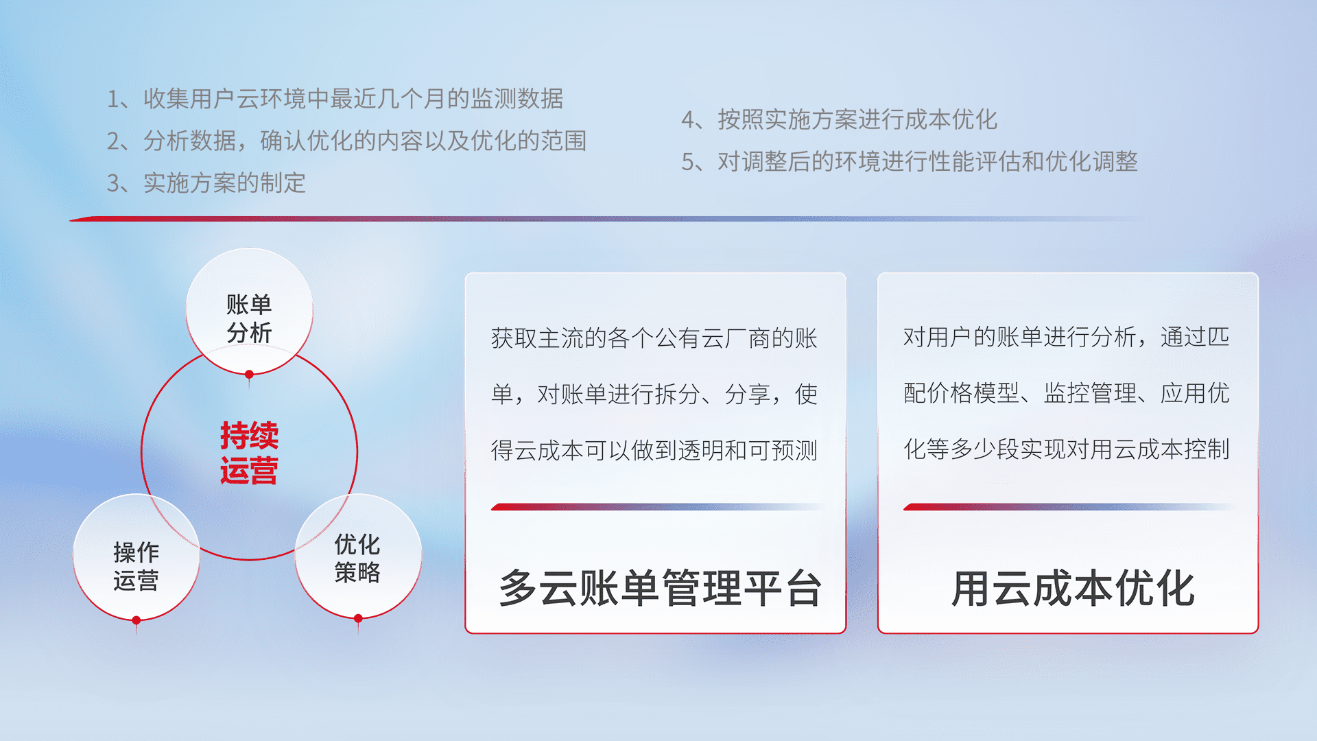 通过多云纳管,,,以统一的资源数据模型把客户的云资源进行抽象和封装,,,进而实现对多云资源的统一操作,,,,保障云资源管理的可靠性、、、、稳定性与可用性。。量身定制化运维内容,,,配置、、、、开发运维、、补丁管理、、、、备份、、、、监控、、认证和访问管理、、、、审计和日常巡检等,,保障在用云过程中的可靠度,,,,稳定度以及高可用率。。。。